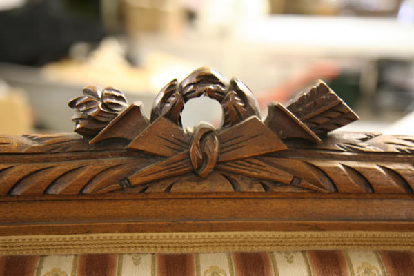 Mahagonifeuerfurnir, spiegelfurniert, schellackhandauspoliert,Böden mit Öl und Wachs behandelt.